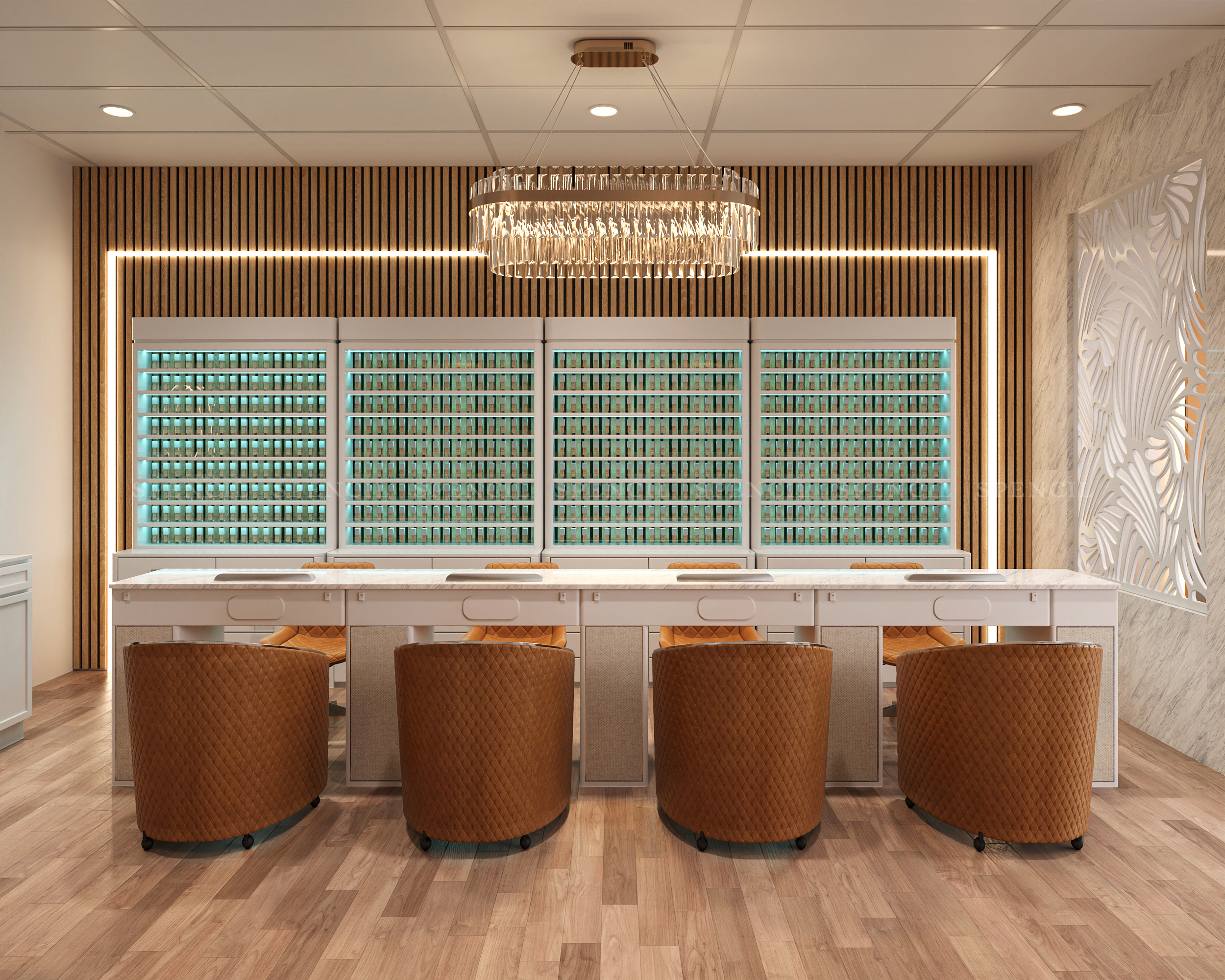 Không cần quá xa xỉ, gỗ công nghiệp, đá nhân tạo hay kính cường lực đều có thể tạo nên một tiệm nail sang trọng nếu biết phối hợp khéo léo.