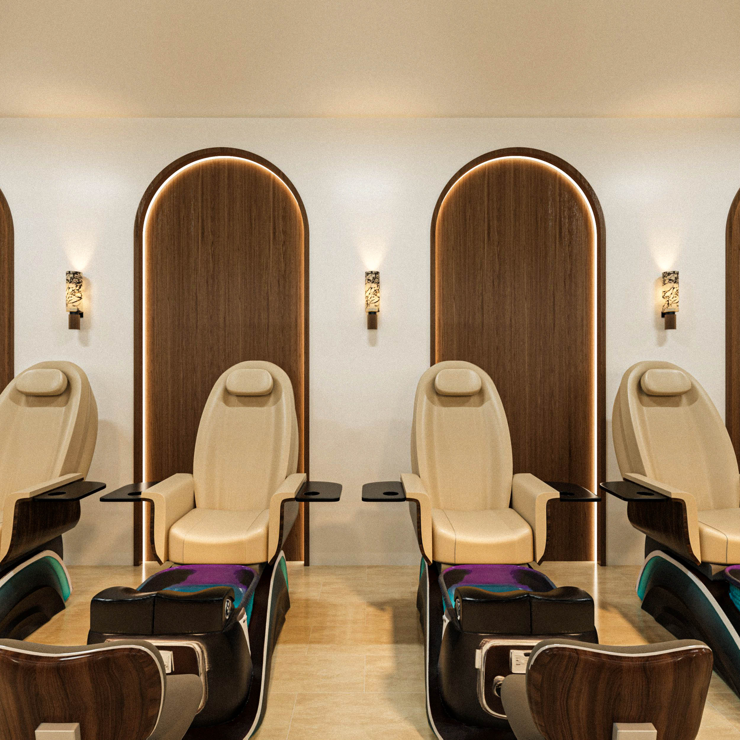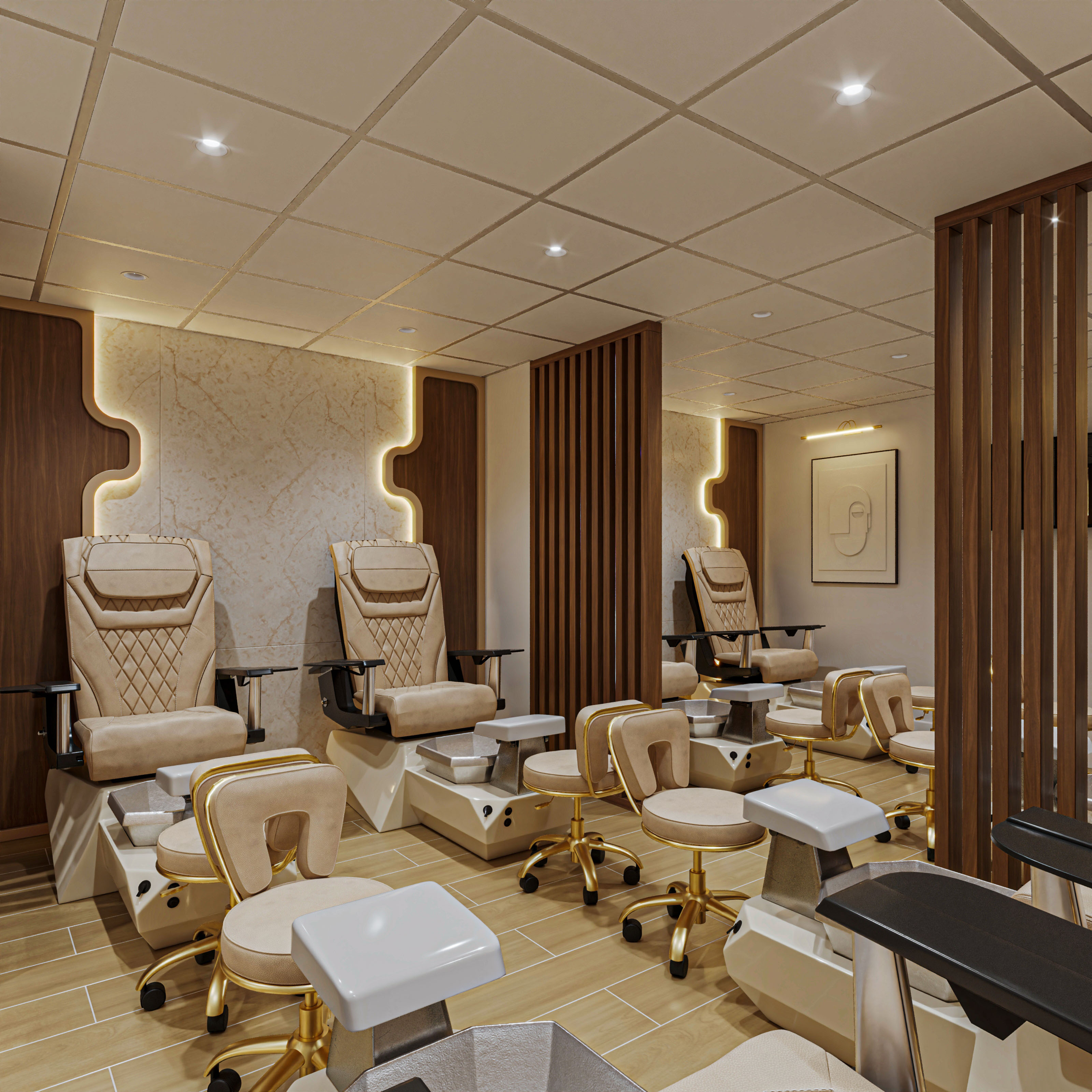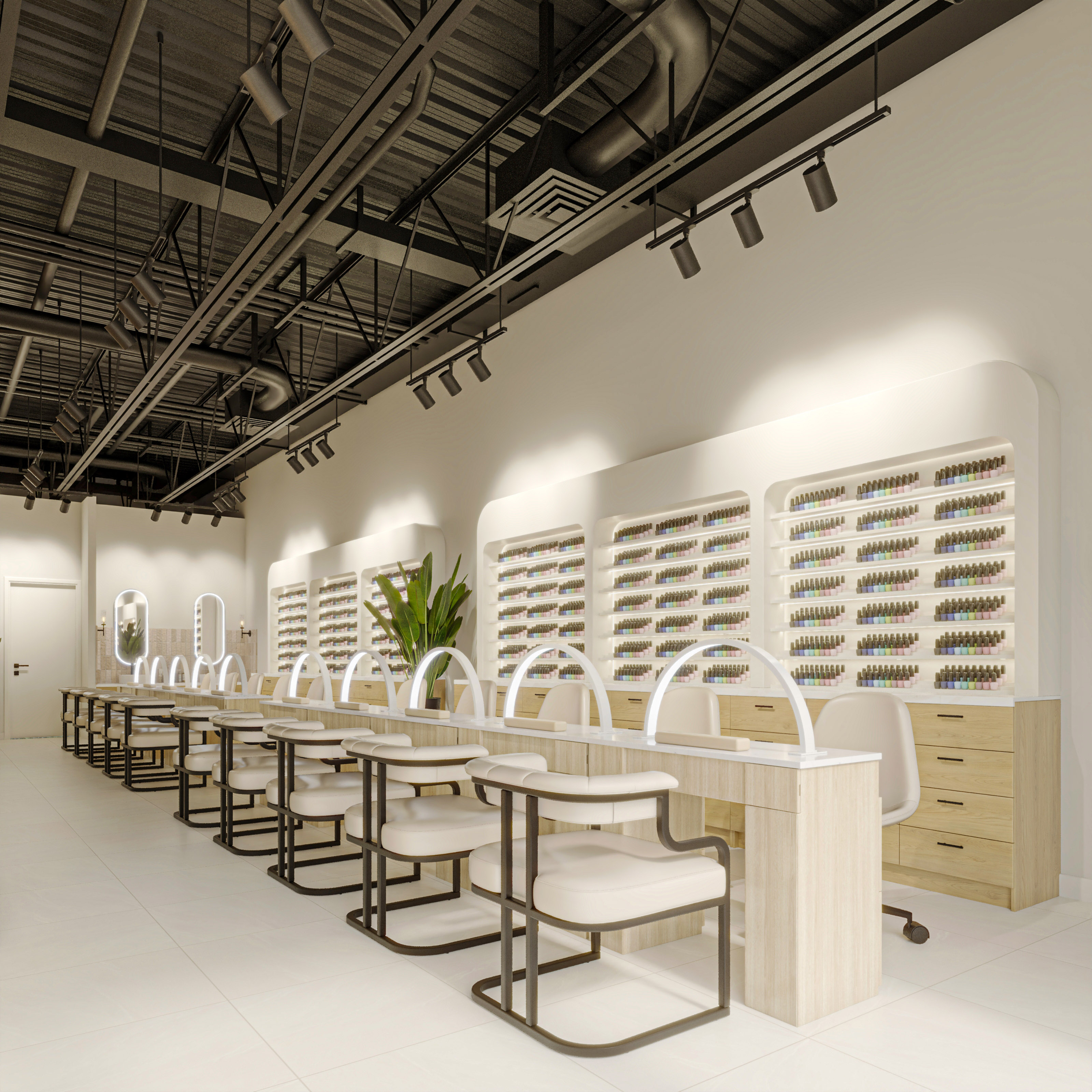 Đây là yếu tố đặc thù mà thiết kế nội thất salon nail khác với interior design nhà ở: acetone, độ ẩm cao, lưu lượng khách dày đặc.