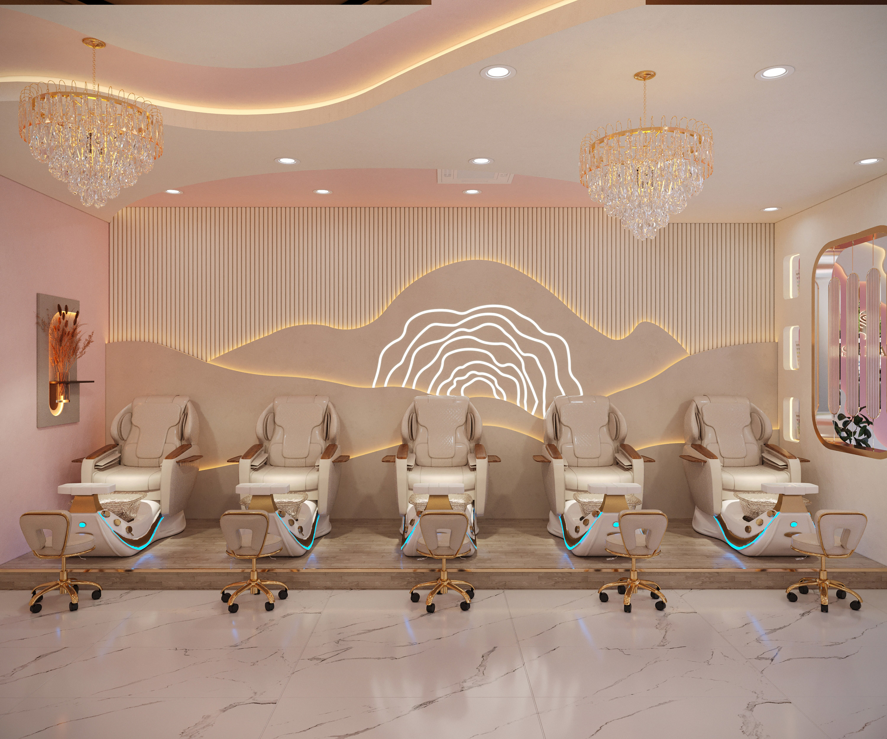 Tiệm nail cần được thiết kế đồng bộ và cân đối từ ngoài vào trong. Mỗi khu vực đều đóng vai trò trong việc xây dựng trải nghiệm và hình ảnh thương hiệu.
